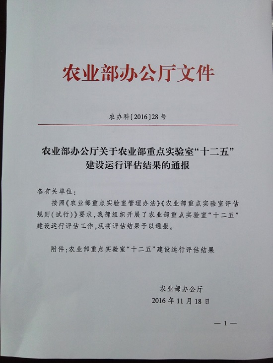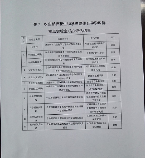 近日,从《农业部办公厅关于农业部重点实验室“十二五”建设运行评估结果的通报》(农办科[2016]28号)获悉,我司“农业部棉花生物学与遗传育种重点实验室”顺利通过农业部重点实验室“十二五”建设运行评估,并获得“优秀”成绩。