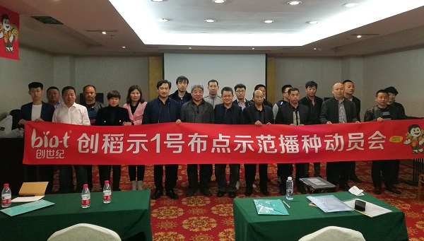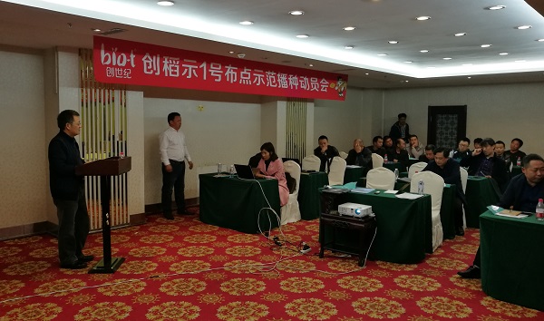动员会上,与会人员先后听取了2016年度创稻示1号布点示范经销商的情况介绍;李海慧副主任介绍了寒地杂交粳稻的品种特性、栽培技术要点,并对示范户提出的摆盘密度、插秧密度、分蘖数量、倒伏情况、产量情况等问题做了详尽的解答; 2016年度成功召开了现场观摩会的850农场示范户侯春良、万庆示范户王艳福,就创稻示1号示范种植情况做了经验分享与交流;韩宗城副总经理总结了2016年度的示范工作,对2017年度的示范工作做了安排部署,并对经销商在布点示范上提出了具体要求:一是选择责任心强、会管理的示范户;二是选择交通便利、种植环境适宜的地块;三是建立种植户档案并定期回访跟踪;四是每个渠道都要召开至少2场观摩会;五是参会经销商、种植户要亲临田间,现场抓好育秧、插秧关键环节。