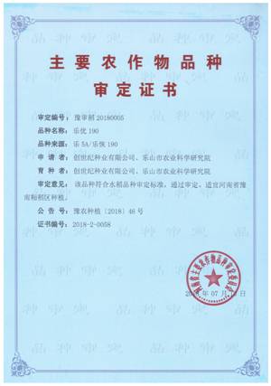 近日,我司科研育种再获新成果:由创世纪种业有限公司与乐山市农业科学研究院联合作选育的杂交水稻新组合乐优190于2018年7月13日通过河南省主要农作物品种审定(审定编号:豫审稻2018005)。