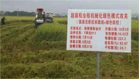 2017年11月16日,广东省农业厅组织国家杂交水稻工程技术研究中心、中国科学院华南植物所等单位有关专家对在广东省兴宁市新陂镇新金村实施的“Y两优911+钵苗机插秧+机械化病虫绿色防控”140亩示范片按农业部超级稻测产方法进行现场测产验收,平均亩产774.2公斤。