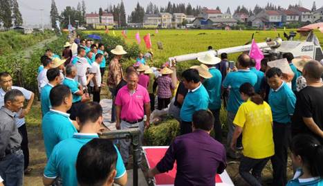 参会代表在营销副总裁朱发林先生的带领下,兴致勃勃来到田间,迫不及待的想要见到传说中的“黄金稻”。该示范片于5月20日播种,9月20日成熟,实际收获面积440平方米,平均亩产达1622斤,实现虾田亩产突破800公斤的大关,相比其他虾田品种,产量高出300-400斤/亩。种植大户一致认为“Y两优911”产量高、米质好、生育期适中,非常适合在湖北做虾田和一季晚稻栽培。