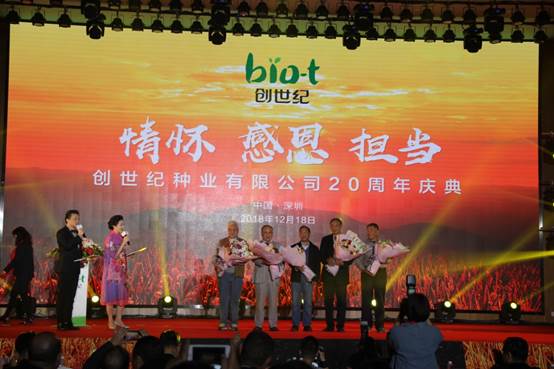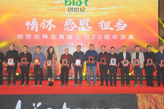 论坛会结束后,公司举办了以“情怀、感恩、担当”为主题的颁奖晚会,一曲开场舞拉开了“一路有你 砥砺前行”感恩晚会的序幕。晚会以董事长至未来的一封信,讲述董事长吴开松先生“我是农民的儿子,为农民做点事是我最大的心愿”的伟大情怀。杨雅生总裁围绕创世纪二十年来的突出成就及为发展规划做了精彩的致辞。二十年来,通过创世纪人的艰苦创业取得的突出成就:公司业务不断拓展为从事植物生物技术研究、棉花、玉米、水稻、小麦、油菜等五大农作物新品种选育繁育、生产加工、营销服务和农作物、蔬菜、花卉等种子(种苗)进出口业务;公司高度重视科研育种工作,构建了生物技术中心+种质创新中心+粮棉油作物育种中心“三位一体”的现代高效商业化生物育种体系。已获得国家发明专利40项,已申请抗虫基因、耐旱、耐盐基因、抗除草剂基因等发明专利数十项和PCT百余项;公司及参控股公司自主及合作选育审定(登记)了34个棉花、玉米、水稻、油菜新品种;植物抗耐逆研究技术、寒地杂交粳稻技术、超级稻育种技术、三系杂交小麦技术等均处于国际领先或先进水平;公司已在全国不同生态区建成规范和稳定的制(繁)种基地;建成河南温县、新疆库尔勒、阿克苏、湖南长沙等4个现代化的种子加工厂,在湖北、安徽、河北、南疆、北疆、黑龙江、河南、湖南等五大作物主产区分别建立了大区营销中心,营销网点近千个;公司先后斥巨资建设了库尔勒创世纪加工厂、汇隆棉业公司加工厂、温县加工厂、龙岗、大鹏和海南生物园、各生态区域玉米水稻棉花等育种站及今天正式搬入的创世纪种业大厦等基建项目;为科研、育种、生产、加工和办公提供了强有力的保证;公司先后被评为“国家级高新技术企业”、“中国种业信用骨干企业”、“中国种业信用评级AAA级信用企业”、“广东省农业龙头企业”、“广东省育繁推一体化种业骨干企业”;公司“抗虫棉产业化项目”被国家发改委评为“国家级高新技术产业示范工程”;与山东棉花研究中心合作的“高产稳产棉花品种鲁棉研28号选育与应用”项目被评为“国家科技进步奖二等奖”。