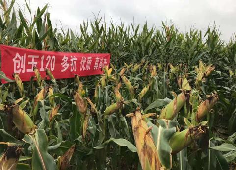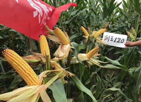 创玉120:国审玉20190308,适宜在黄淮海夏玉米类型区种植。出苗至成熟102天,比对照郑单958早熟2天。幼苗叶鞘紫色,叶片绿色,叶缘绿色,花药浅紫色,颖壳浅紫色。株型半紧凑,株高282厘米,穗位高100厘米,成株叶片数19片。果穗筒形,穗长16.8厘米,穗行数16行,穗粗4.9厘米,穗轴红色,籽粒黄色、半马齿型,百粒重33.6克。大田抗病表现,中抗小斑病、茎腐病。品质分析,籽粒容重756克/升,粗蛋白含量9.66%,粗脂肪含量3.45%,粗淀粉含量74.98%,赖氨酸含量0.33%。2017-2018年参加黄淮海夏玉米组区域试验,两年平均亩产658.4千克,比对照郑单958增产5.1%。2018年生产试验,平均亩产606.8千克,比对照郑单958增产4.2%。