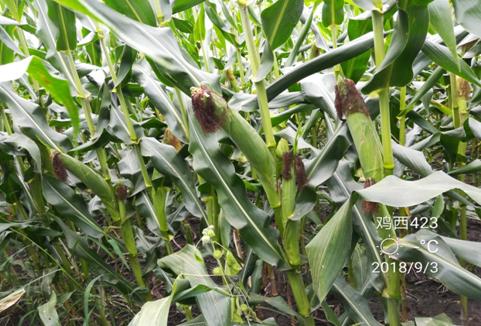 创玉423:国审玉20190064,适宜在东华北中早熟春玉米区的黑龙江省第二积温带种植。出苗至成熟127天,比对照吉单27晚熟1.1天。幼苗叶鞘紫色,叶片绿色,叶缘白色,花药紫色,颖壳绿色。株型半紧凑,株高305厘米,穗位高111厘米,成株叶片数18片。果穗筒形,穗长21.9厘米,穗行数14-20行,穗粗5.0厘米,穗轴红,籽粒黄色、半马齿,百粒重34.85克。接种鉴定,中抗茎腐病、穗腐病。品质分析,籽粒容重750克/升,粗蛋白含量8.55%,粗脂肪含量3.54%,粗淀粉含量76.92%,赖氨酸含量0.26%。2017-2018年参加东华北中早熟春玉米组区域试验,两年平均亩产807.2千克,比对照吉单27增产6.6%。2018年生产试验,平均亩产764.3千克,比对照吉单27增产9.2%。