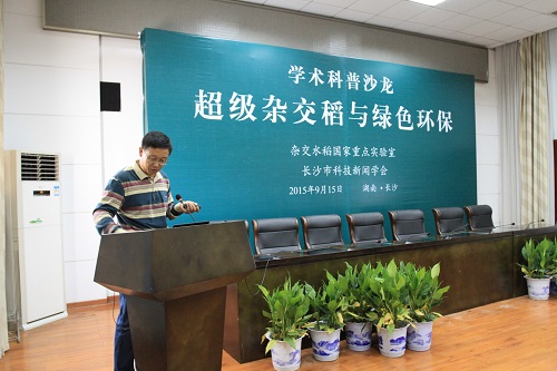 但随着去年安徽“两优0293”万亩超级稻绝收减产事件爆炒,以及超级稻超高产攻关试验数据的深度报道,经个别有影响的外行学者误读误导,让许多不明真相的人民群众误以为超级稻就必然不环保、不好吃,而且只能种植在试验田,不适合大面积推广。为回应这些社会质疑,2015年9月15日,杂交水稻国家重点实验室和长沙市科技新闻学会共同举办“超级杂交稻与绿色环保学术科普沙龙”活动。杂交水稻国家重点实验室主任符习勤研究员、长沙市科技新闻学会理事长左涛先生、湖南省水稻所副所长张玉烛研究员等领导、专家和企业代表及中国科学报、科技日报、湖南日报、湖南经济电视台等30多家媒体记者朋友合计40余人参加了此次活动,我司超级稻首席科学家邓启云博士应邀参加。