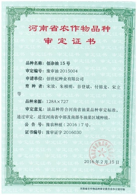 由我司棉油育种中心自主选育的油菜新组合“创杂油15号”,于2016年2月15日通过河南省审定,审定编号豫审油2015004。创杂油15号属甘蓝型半冬性双低杂交油菜品种,全生育期229.3~233.4天;抗性好,表现在对菌核病低抗类型,对病毒病抗病类型,霜霉病和白锈病田间未见发病。在产量表现上,2010~2011年度区域试验,平均亩产195.5kg,比对照增产16.2%;2011~2012年度续试,平均亩产173.1kg,比对照增产1.2%;2013~2014年度生产试验,平均亩产182.5kg,比对照增产6.7%。该品种适宜河南省中部及南部冬油菜区域种植。(熊万光)