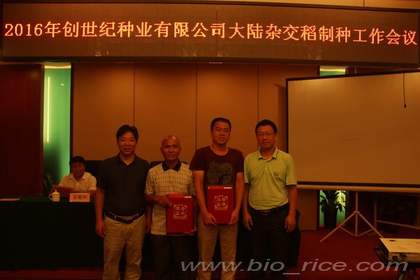 为表彰先进,公司从生产规模、单产、质量、忠诚度等多方面综合考评,对在2015年度大陆杂交水稻制种工作中表现突出的6位生产商代表分别授予了“优秀生产商”、 “银牌生产商” 和“金牌生产商”等荣誉称号,生产中心副总石祖兴、总经理宋运钟、常务董事兼首席科学家邓启云分别为获奖者颁奖。